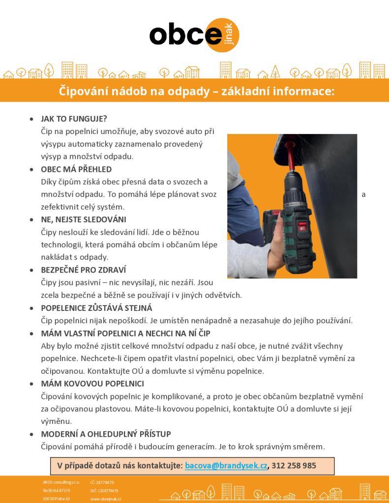 Vystavené popelnice budou za účasti zástupce obce opatřeny čipem. Očipované popelnice budou viditelně označeny samolepkou nebo nápisem „ČIP“. Takto označenou popelnici je již možné uklidit.