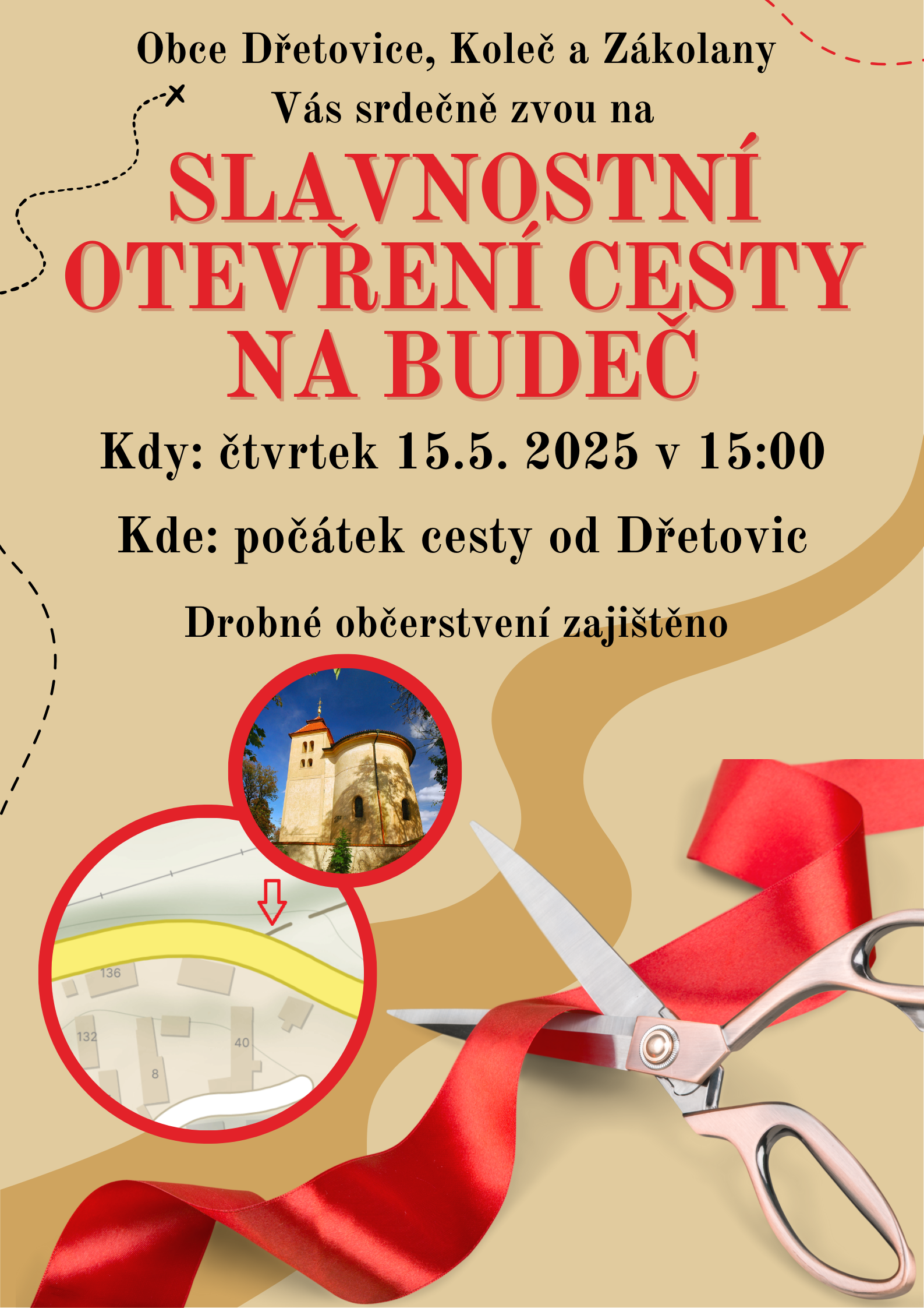 Srdečně zveme všechny občany a návštěvníky na slavnostní otevření cesty na Buděč, které se uskuteční ve čtvrtek 15. května 2025 v 15:00. Akce začne na počátku cesty od Dřetovic. Pro všechny účastníky bude zajištěno drobné občerstvení, takže si přijďte užít příjemné odpoledne se sousedy a přáteli.