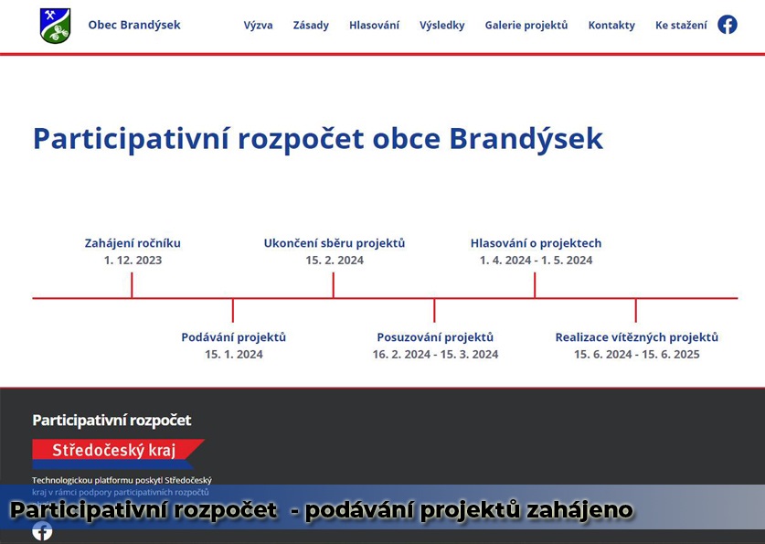 Od dnešního dne může až do 15.2.2024 podávat návrhy projektů, které budou financovány z participativního rozpočtu obce Brandýsek. Všechny informace naleznete na https://www.brandysek.cz/pro-obcany/participativni-rozpocet/