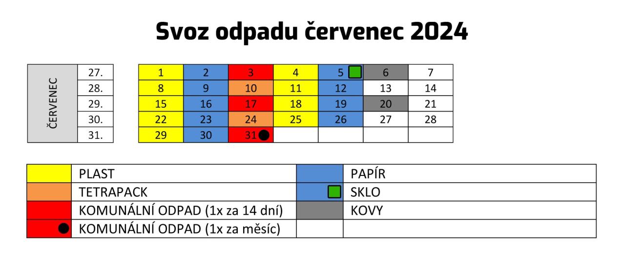 Upozorňujeme občany, že měsíční svoz komunálního odpadu v červenci vychází na poslední středu, tj. 31.7.