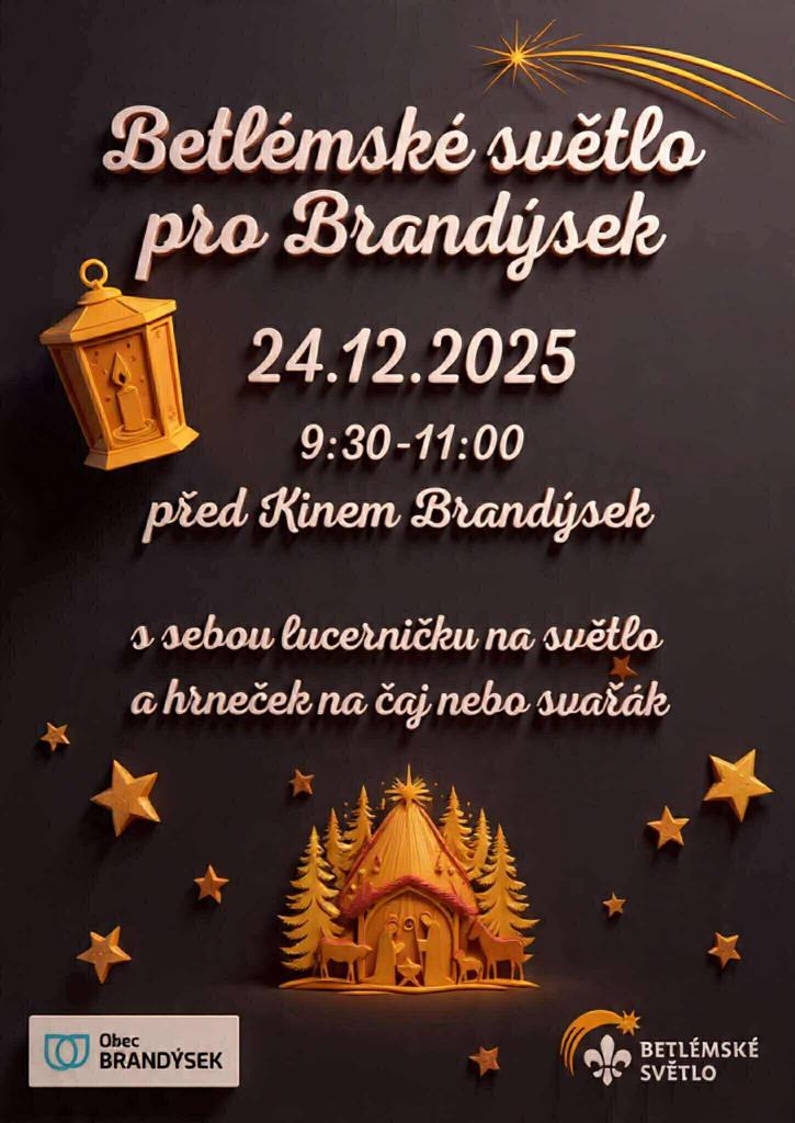 Přijďte si pro Betlémské světlo do Brandýska 24. prosince 2025 od 9:30 do 11:00 před Kinem Brandýsek. Nezapomeňte si vzít lucerničku a hrneček na čaj nebo svařák. Těšíme se na Vaši účast a společné setkání.