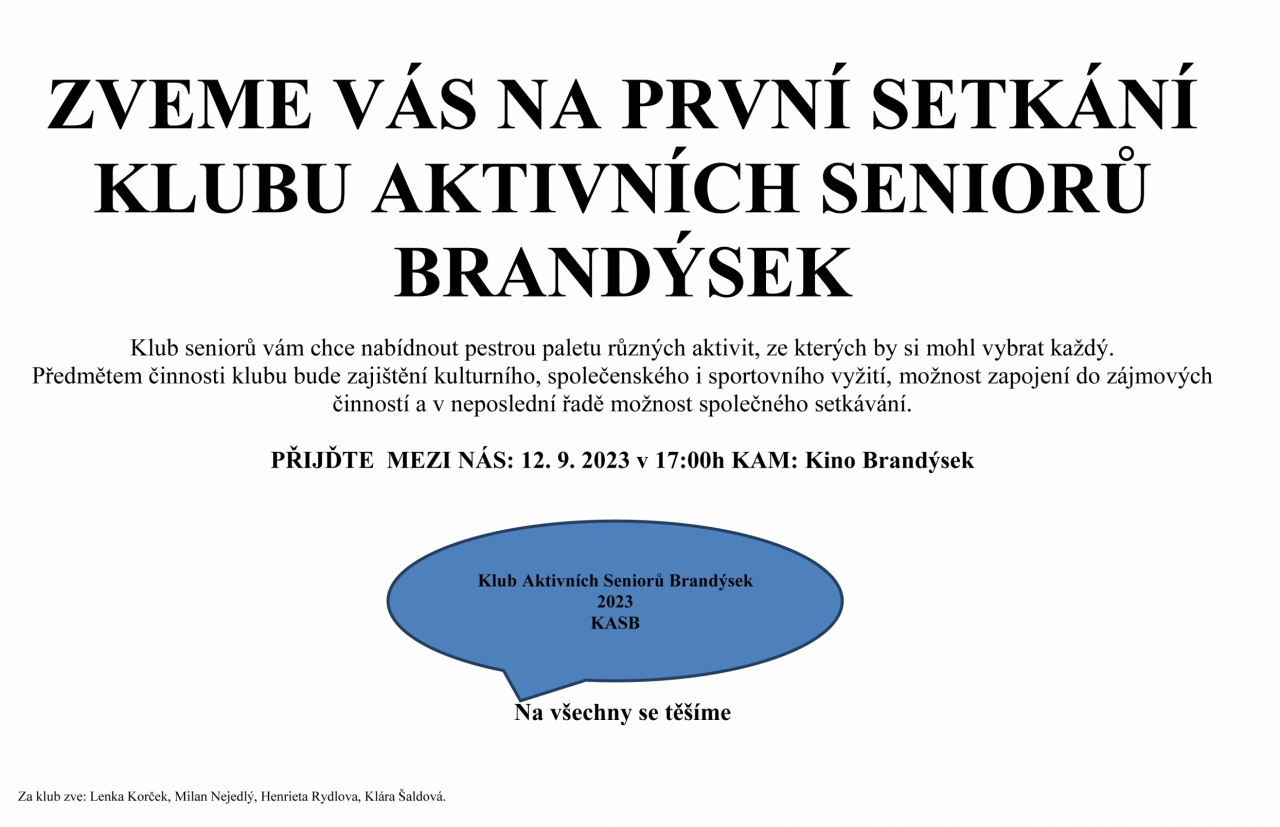 Zveme Vás na první setkání Klubu aktivních seniorů v Brandýsku.