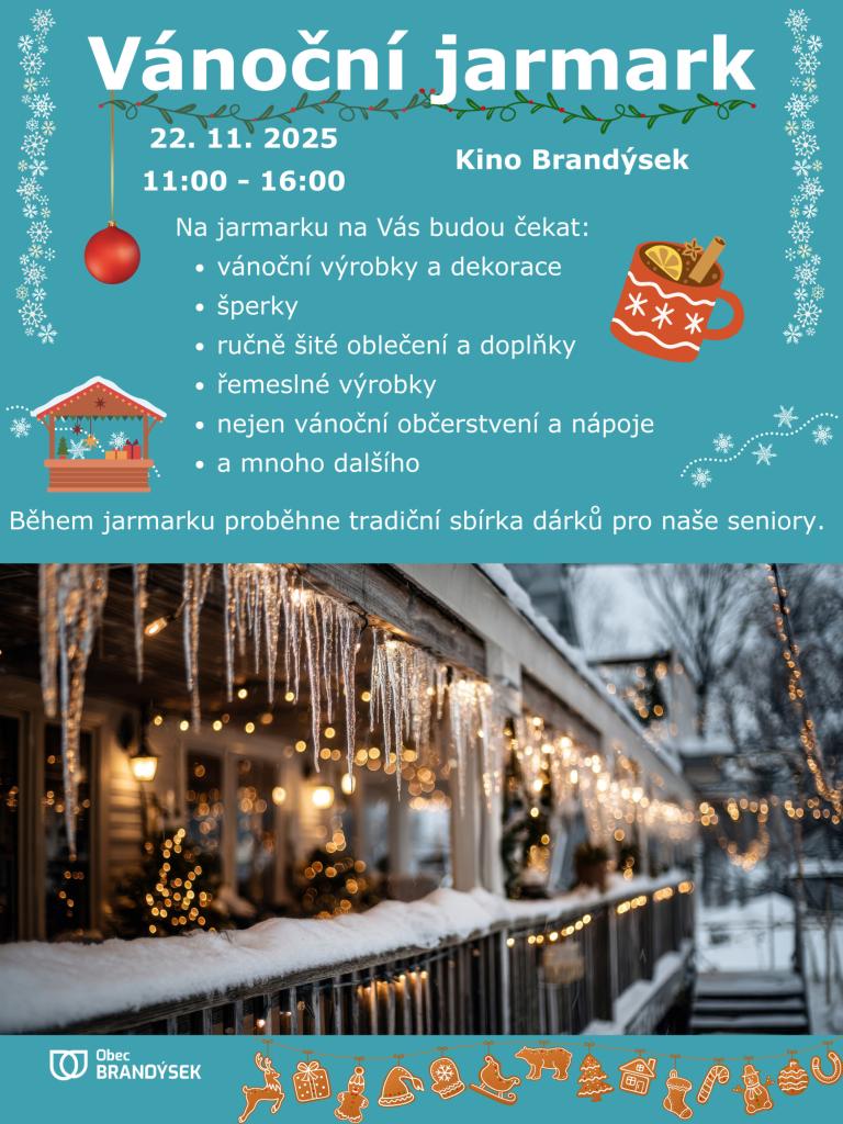 Vánoční jarmark se uskuteční 22. listopadu 2025 od 11:00 do 16:00 v Kině Brandýsek. Na návštěvníky čekají vánoční výrobky, dekorace, šperky a ručně šité oblečení. Kromě toho si budete moci pochutnat na vánočním občerstvení a nápojích. Součástí jarmarku bude i sbírka dárků pro seniory.