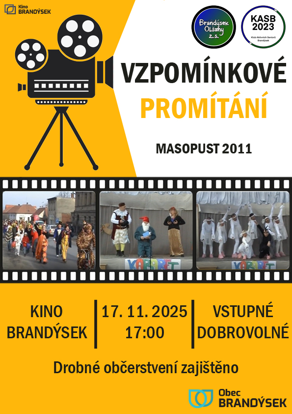 Přijďte na vzpomínkové promítání, které se uskuteční 17. listopadu 2025 od 17:00 v Kině. Společně zavzpomínáme na Masopust 2011. Vstupné je dobrovolné a zajištěno je i drobné občerstvení. Akci pořádá spolek Brandýsek Olšany ve spolupráci s Klubem aktivních seniorů a obcí Brandýsek.